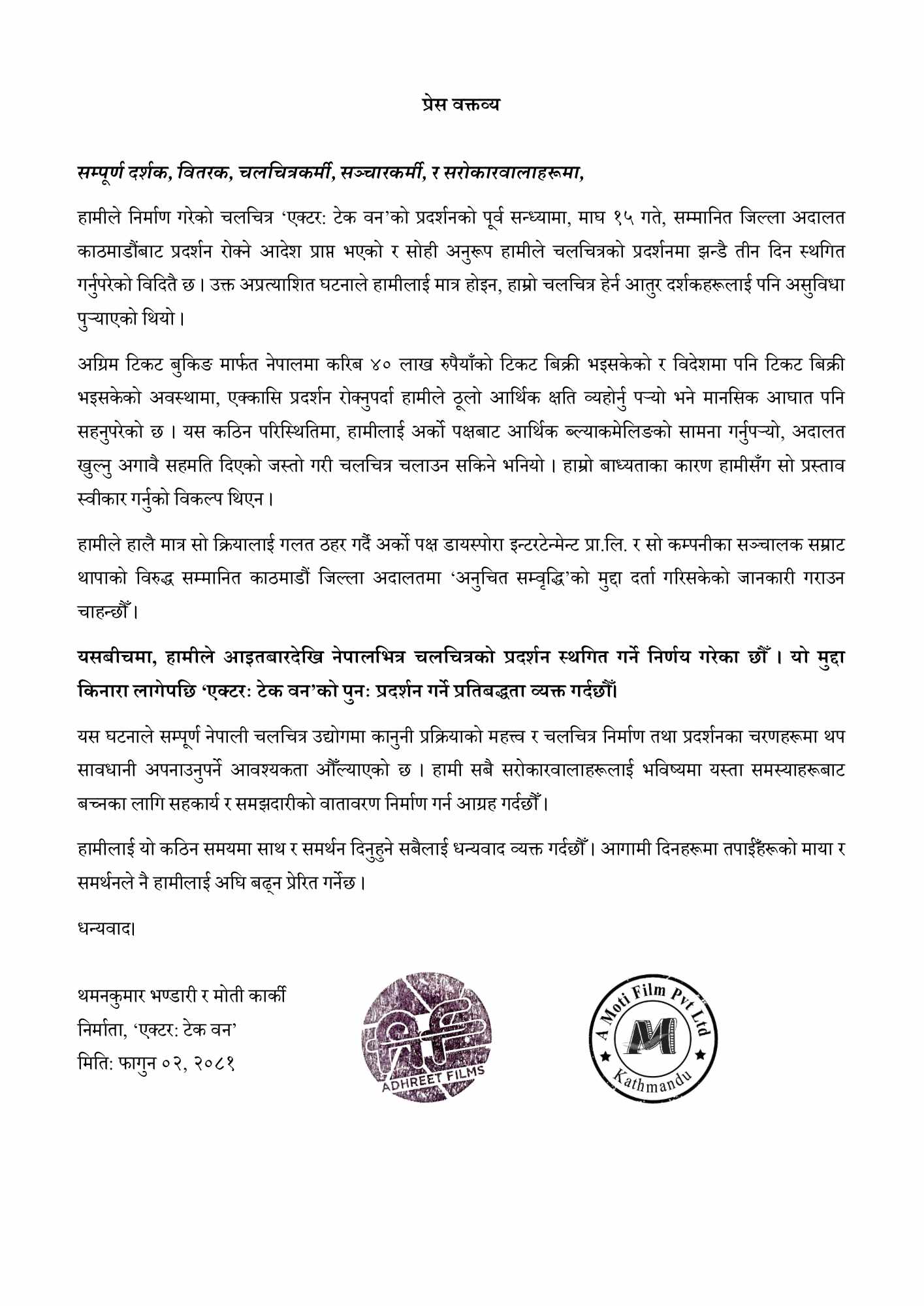 निर्माताहरूले विवाद समाधान नभएसम्म नेपालभित्र आइतबारदेखि ‘एक्टरस् टेक वन’ को प्रदर्शन स्थगित गर्ने निर्णय लिएको जनाएका छन् । “मुद्दा किनारा लागेपछि चलचित्र पुनः प्रदर्शन गर्ने प्रतिबद्धता व्यक्त गर्छौँ,” विज्ञप्तिमा उल्लेख छ ।