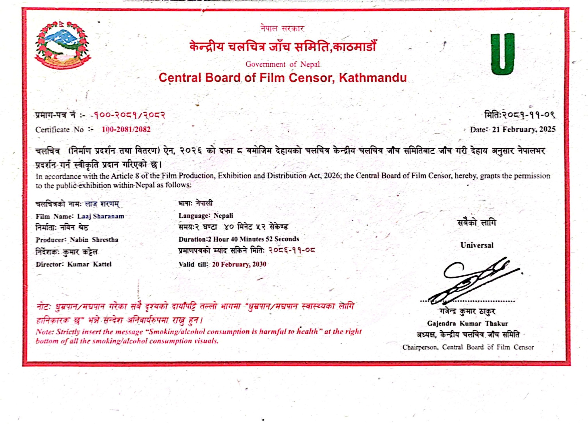 काठमाडौँ  । उच्च अदालत पाटनको आदेशपछि प्रचारप्रसार रोकिएको फिल्म ’लाज शरणम्’ सेन्सर पास भएको छ। केन्द्रीय चलचित्र जाँच समिति (सेन्सर बोर्ड) ले फिल्मलाई सबै उमेर समूहका दर्शकले हेर्न मिल्ने गरी ’युनिभर्सल सर्टिफिकेट’ दिएको छ ।