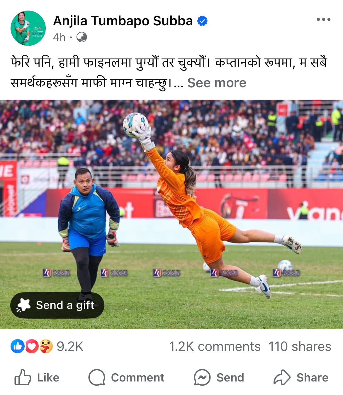 फोर नेसन्स कपको फाइनलमा म्यानमारसँग २–० गोल अन्तरले पराजित भएपछि फेसबुकमा लामो स्टाटस लेख्दै उनले भनेकी छन्, ‘फेरि पनि हामी फाइनलमा चुक्यौं । कप्तानको रुपमा म सबै समर्थकसँग माफी माग्न चाहन्छु ।’ उनले थप लखेकी छन्, ‘मैदानमा उपस्थित १६ हजार दर्शकहरु र सधैं हामीलाई माया गर्ने करोडौं समर्थकहरु, हामीले तपाईंहरुले अपेक्षा गरको र चाहेको नतिजा दिन सकेनौं ।’