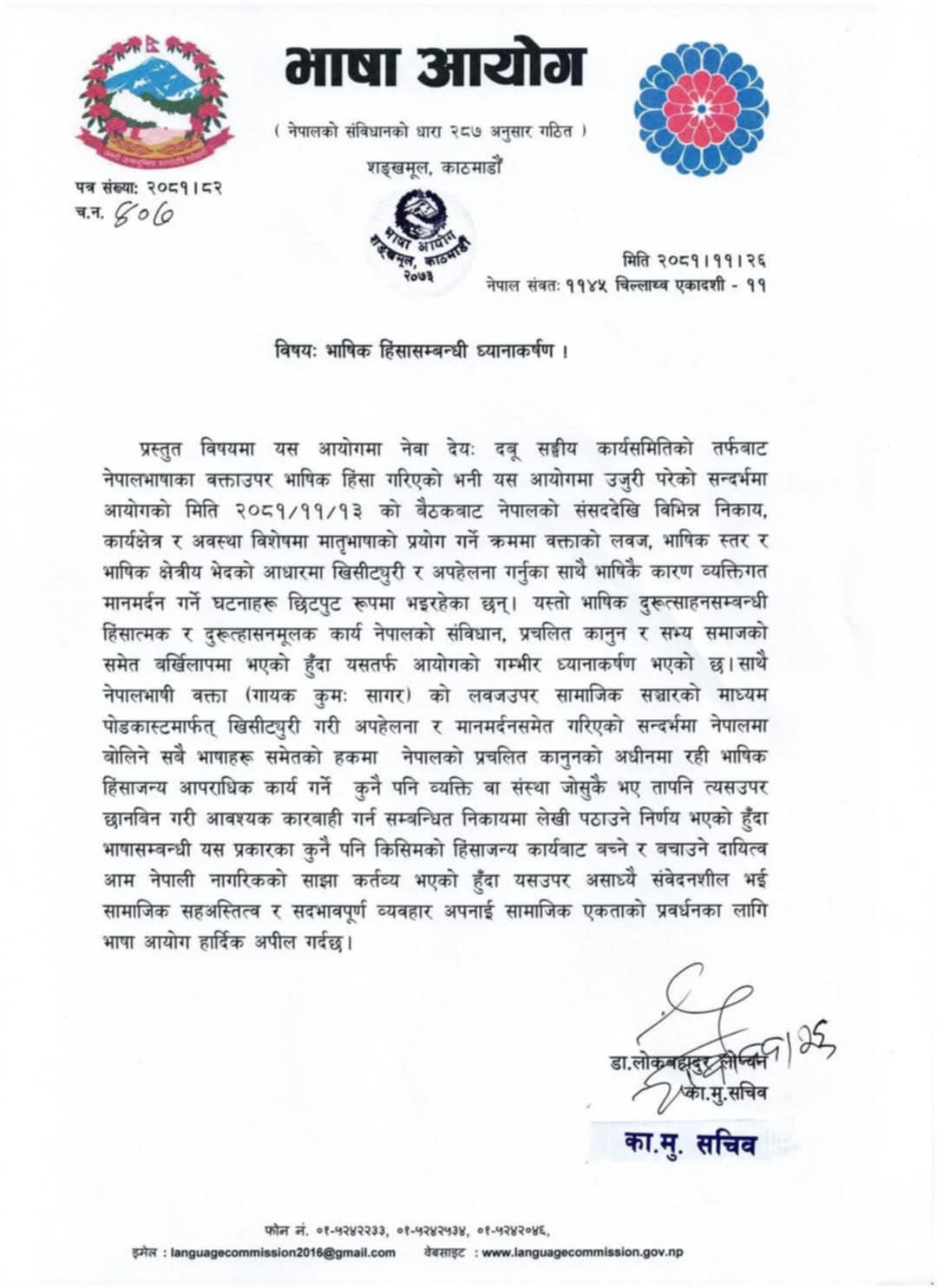 काठमाडौँ । गायक कुमः सागर नेपालभाषी वक्ताको लबजउपर सामाजिक सञ्चारको माध्यम पडकास्टमार्फत खिसिट्युरी गरी अपहेलना र मानमर्दन गरिएको सन्दर्भप्रति भाषा आयोगको ध्यानकर्षण भएको छ । नेवा देय दबू सङ्घीय कार्यसमितिको तर्फबाट नेपालभाषाका वक्ताउपर भाषिक हिंसा गरिएको भनी उजुरी परेपछि आफ्नो ध्यानाकर्षण भएको भन्दै आयोगले आज फागुन २६ गते वक्तव्य निकालेको छ ।