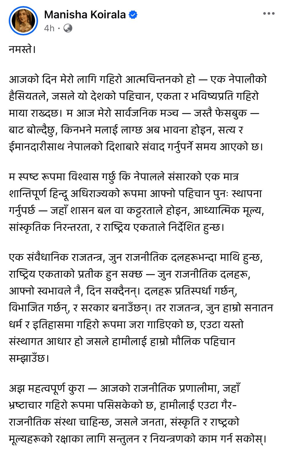 । ‘आजको दिन मेरो लागि गहिरो आत्मचिन्तनको हो — एक नेपालीको हैसियतले, जसले यो देशको पहिचान, एकता र भविष्यप्रति गहिरो माया राख्दछ । म आज मेरो सार्वजनिक मञ्च —फेसबुकबाट बोल्दै छु, किनभने मलाई लाग्छ अब भावना होइन, सत्य र इमानदारीसाथ नेपालको दिशाबारे संवाद गर्नुपर्ने समय आएको छ’, उनले अगाडि लेखेकी छन् ‘म स्पष्ट रूपमा विश्वास गर्छु कि नेपालले संसारको एक मात्र शान्तिपूर्ण हिन्दु अधिराज्यको रूपमा आफ्नो पहिचान पुनः स्थापना गर्नुपर्छ — जहाँ शासन बल वा कट्टरताले होइन, आध्यात्मिक मूल्य, सांस्कृतिक निरन्तरता, र राष्ट्रिय एकताले निर्देशित हुन्छ ।’