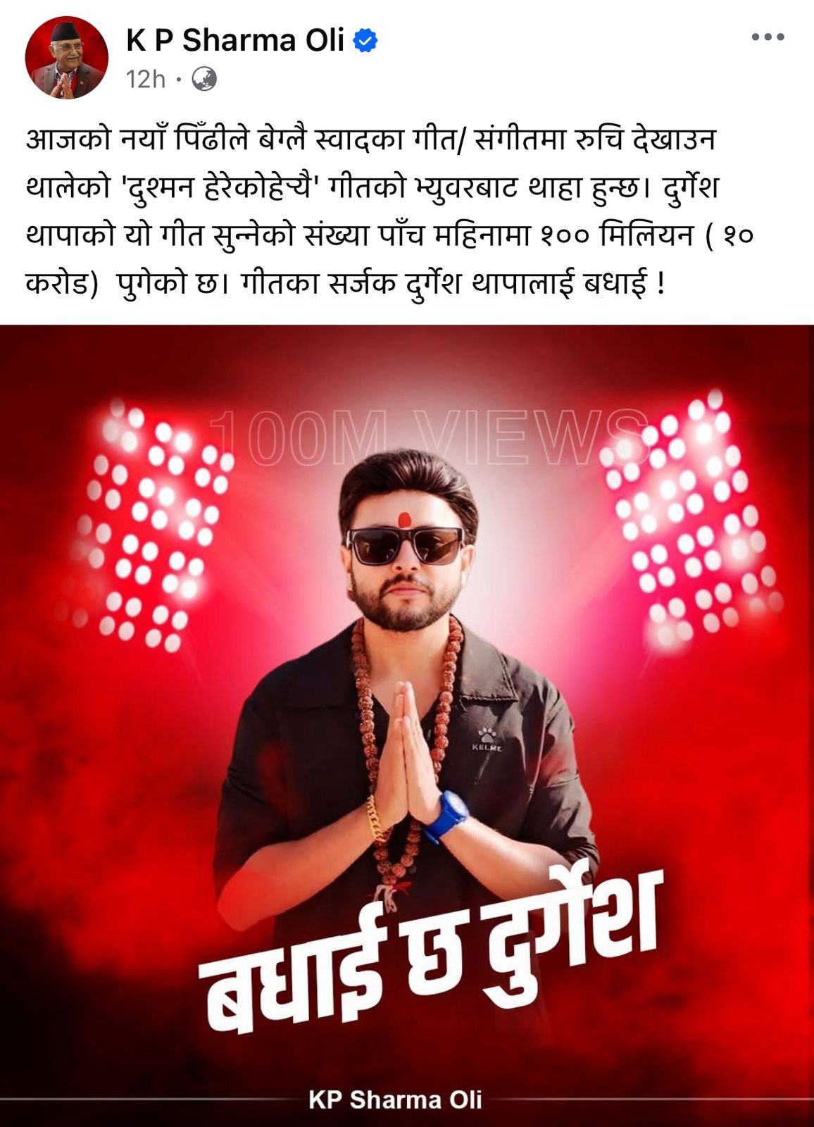 प्रधानमन्त्रीले लेखेका छन्,‘आजको नयाँ पिँढीले बेग्लै स्वादका गीतर संगीतमा रुचि देखाउन थालेको ’दुश्मन हेरेको हेर्यै’ गीतको भ्युवरबाट थाहा हुन्छ। दुर्गेश थापाको यो गीत सुन्नेको संख्या पाँच महिनामा १०० मिलियन ( १० करोड) पुगेको छ। गीतका सर्जक दुर्गेश थापालाई बधाई ’।