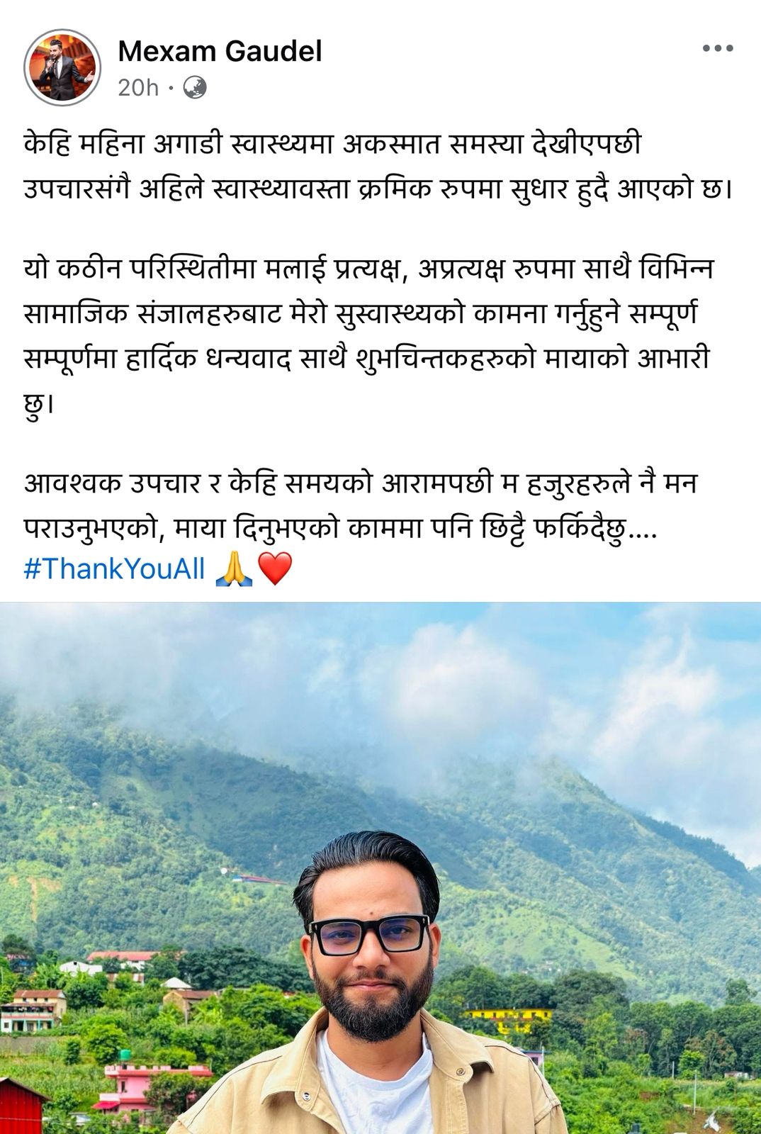 आफनो स्वास्थ्य अवस्थाप्रती फयानहरुलाई जानकरी गराउँदै उनले लेखेका छन्, ‘आवश्वक उपचार र केही समयको आरामपछि म हजुरहरूले नै मन पराउनुभएको, माया दिनुभएको काममा पनि छिट्टै फर्किँदैछु।’ कमेडी च्याम्पियन’ बाट चर्चामा आएका मेक्सम पछिल्लो समय ’कमेडी नाइट विथ च्याम्पियन्स मा देखिँदै आएका थिए ।