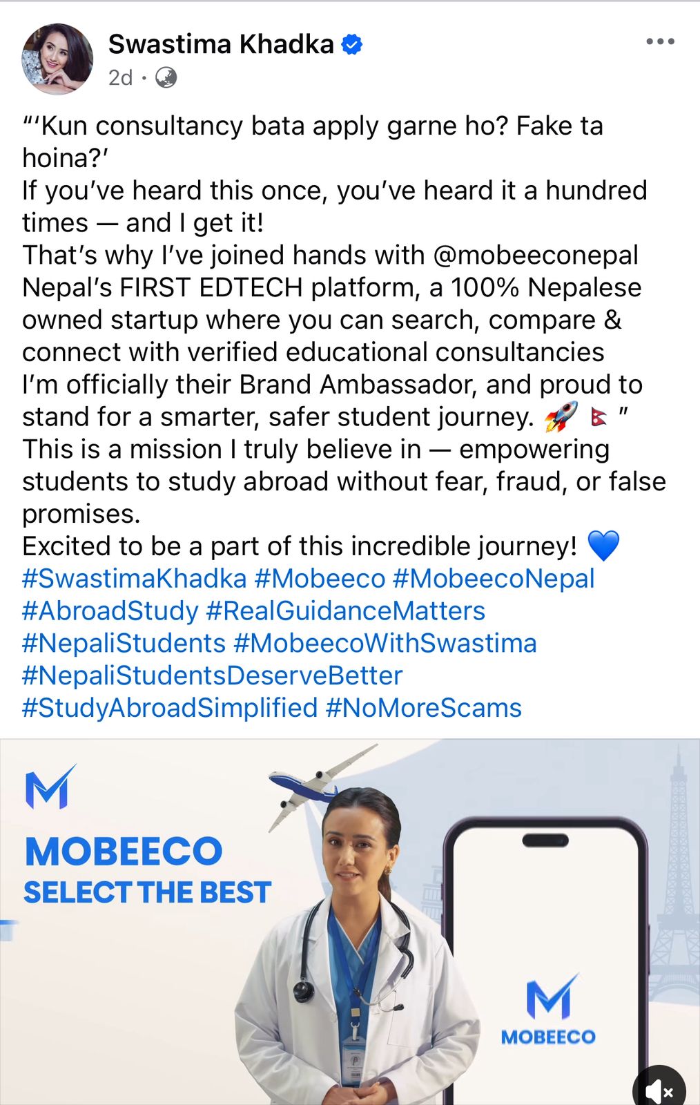 काठमाडौं । एड-टेक प्लाटफर्म ‘मबिको एप’को व्यवसायिक दूतमा अभिनेत्री स्वस्तिमा खड्का नियुक्त भएकी छन् ।अभिनेत्री खड्काले पनि सामाजिक संजालबाट आफू ब्रान्ड एम्बेसडर बनेको जानकारी दिएकी छन् ।