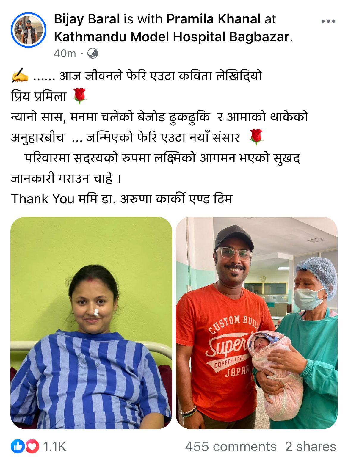 उनले फेसबुकबाट फोटो सेयर गर्दै प्रशंसकलाई यसबारे जानकारी दिएका छन् ।उनी लेख्छन्, ‘आज जीवनले फेरि एउटा कविता लेखिदियो प्रिय प्रमिला । न्यानो सास, मनमा चलेको बेजोड ढुकढुकि र आमाको थाकेको अनुहारबीच जन्मिएको फेरि एउटा नयाँ संसार । परिवारमा सदस्यको रुपमा लक्ष्मीको आगमन भएको सुखद जानकारी गराउन चाहेँ । धन्यवाद ममी डा. अरुणा कार्की एण्ड टिम ।’