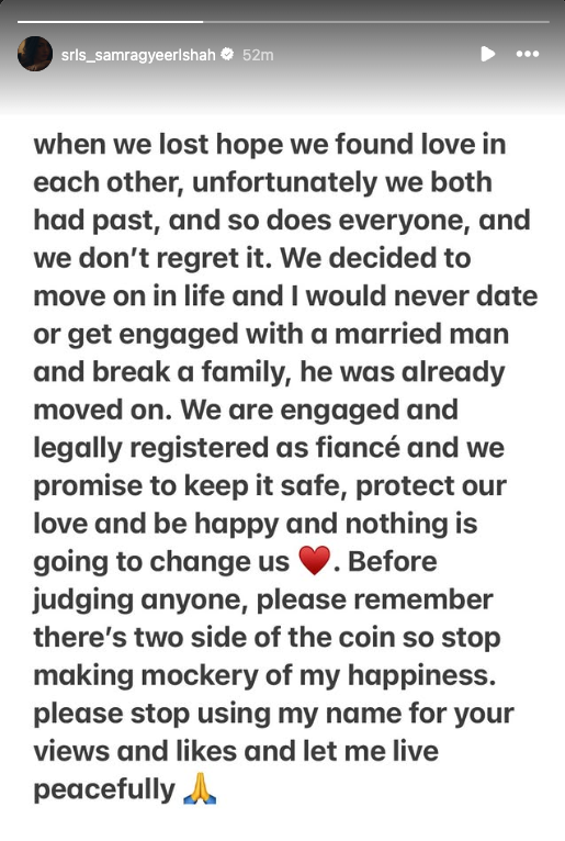 ”जब हामीले आशा गुमायौं, हामीले एकअर्कालाई माया पायौं, दुर्भाग्यवश हामी दुवैको विगत थियो, र सबैजना पनि त्यस्तै छन्, र हामीलाई पछुतो छैन। हामीले जीवनमा अगाडि बढ्ने निर्णय गर्यौं र म कहिल्यै विवाहित पुरुषसँग डेट गर्ने वा इन्गेजमेन्ट गर्ने छैन र परिवार तोड्ने छैन, ऊ पहिले नै बिग्रिसकेको थियो। हामी इन्गेजमेन्ट भएका छौं र कानुनी रूपमा मंगेतरको रूपमा दर्ता भएका छौं र हामी यसलाई सुरक्षित राख्ने, हाम्रो प्रेमको रक्षा गर्ने र खुसी हुने वाचा गर्छौं र हामीलाई केहि पनि परिवर्तन गर्ने छैन। कसैलाई न्याय गर्नु अघि, कृपया सम्झनुहोस् कि सिक्काका दुई पाटा छन् त्यसैले मेरो खुशीको मजाक उडाउन बन्द गर्नुहोस्। कृपया आफ्नो विचार र मनपर्नेको लागि मेरो नाम प्रयोग गर्न बन्द गर्नुहोस् र मलाई शान्तिपूर्वक बाँच्न दिनुहोस्।”